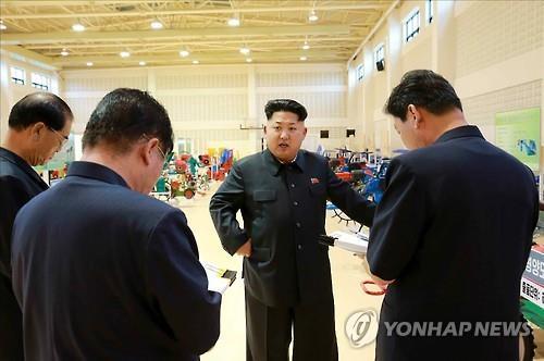 | △ 농기계 전시장에서 관계자들에게 지시하는 김정은 북한 국방위원회 제1위원장 |