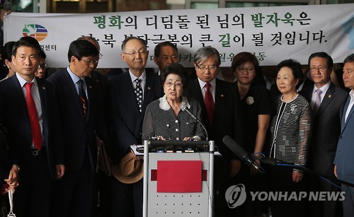 | △ 방북 소감 밝히는 이희호 여사 (서울=연합뉴스) 이정훈 기자 = 3박 4일간의 방북 일정을 마친 이희호 여사가 8일 오후 김포공항을 통해 귀국, 방북 소감을 밝히고 있다. 2015.8.8 uwg806@yna.co.kr |