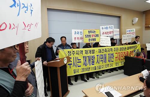 | △ 청주 재개발·재건축지역 주민생존권 대책위원회가 작년 11월 "주민 혼란만 가중시키는 용적률 상향 조성은 재고해야 한다"는 내용의 기자회견을 여는 모습. <<연합뉴스 DB>> |