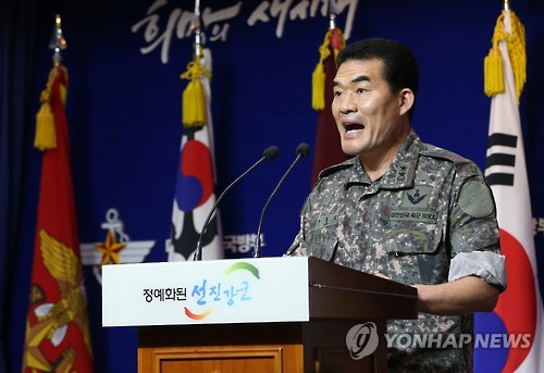 | △ 군 "북한 도발에 응당한 혹독한 대가 치르게 할 것" (서울=연합뉴스) 임헌정 기자 = 구홍모 합동참모본부 작전부장이 10일 서울 용산 국방부에서 북한이 비무장지대(DMZ)에 살상용 목함지뢰를 매설한 행위와 관련한 대북성명을 발표하고 있다. |
