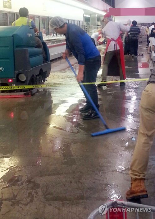 | △ 경기북부 강한 소나기로 대형마트 일부 침수 (의정부=연합뉴스) 노승혁 기자 = 8일 오후 천둥과 번개를 동반한 강한 소나기가 내린 경기북부지역에 낙뢰로 인한 화재 38건이 발생했다. 이날 오후 2시께 의정부시 민락동 외국계 대형 상점 1층 매장이 갑자기 쏟아진 소나기 때문에 침수돼 직원들이 2시간여 동안 물을 뺐다. 2015.8.8 <<독자제공>> nsh@yna.co.kr |