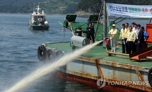 | △ "적조를 잡아라"…황토 살포 시연 (통영=연합뉴스) 최병길 기자 = 10일 오후 경남 통영시 산양읍 연명마을 앞 해상에서 열린 '2015년 적조대응 방제훈련'에서 김동진 통영시장이 적조 발생에 대비해 황토를 살포하는 시연을 펼치고 있다. 2015.7.10 choi21@yna.co.kr |