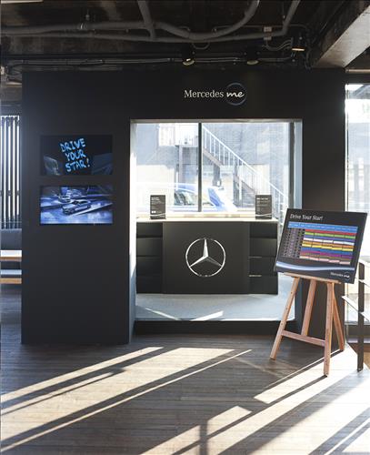 오픈 테라스형 카페와 차량 전시장이 결합된 형태로 운영되는 이 팝업 스토어는 메르세데스-벤츠 브랜드에 관심 있는 사람이면 누구나 방문할 수 있다.
