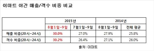 11일 이마트에 따르면 이달 1일부터 9일까지 전체 고객 가운데 오후 8시 이후 매장을 방문한 고객의 비중은 30.2%로 지난해 같은 기간(27.1%)보다 3.1%P 늘었다. 지난달 1~9일(26.4%)과 비교해도 3.8%P 많은 수준이다.