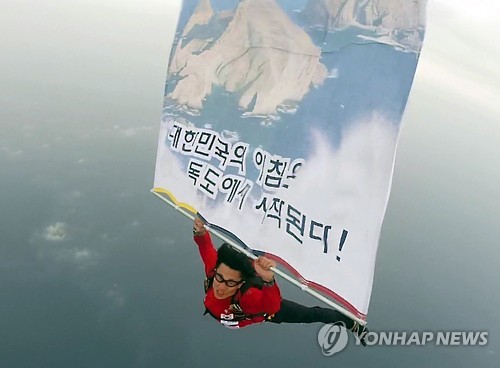 | △ 대한민국의 아침은 독도에서 시작된다 (부산=연합뉴스) 광복 70주년을 맞아 11일 오전 독도 상공에서 국가대표 스카이다이버 이대호씨가 3천m 상공에서 고공 낙하하며 '대한민국의 아침은 독도에서 시작된다'는 현수막을 펼치고 있다. 2015.8.11 << 이대호씨 >> wink@yna.co.kr |