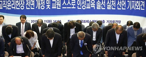 | △ 고개숙여 사과하는 교원단체 대표들 (서울=연합뉴스) 황광모 기자 = 한국교원단체총연합회(교총)와 17개 시·도 교원단체총연합회, 한국초·중·고교장연합회 등 교원단체가 11일 오후 서울 태평로 프레스센터에서 열린 기자회견에서 최근 발생한 교사 연쇄 성추행 파문과 관련한 사과를 하고 있다. 이날 회견에서 교원단체 회원들은 "철저한 자성을 통해 환골탈태 노력하겠다" 교직윤리헌장 전면개정 착수를 발표했다. |