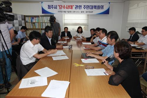 (청주=연합뉴스) 김형우 기자 = 나흘간 사상 최악의 수돗물 단수 사태로 피해를 본 지역주민들과 상인들이 향후 대책을 논의하기 위해 11일 열린 주민대책회의는 청주시의 안일하고 부실한 대책을 맹비난하는 '성토장'이었다.
