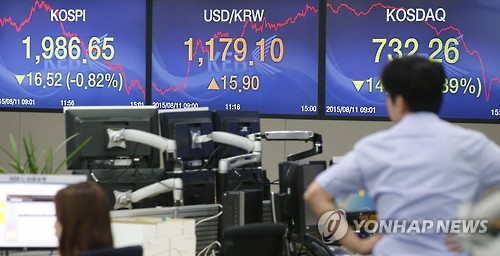 이날 오전 상승세를 보이던 코스피도 위안화 평가절하에 대한 부담으로 전 거래일보다 16.52포인트(0.82%) 내린 1,986.65로 마감했다. 종가 기준으로 코스피가 2,000선 밑으로 떨어진 것은 지난 3월16일(1987.33) 이후 처음이다.