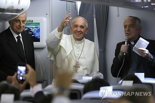| △ (AP=연합뉴스) 남미 3개국 순방을 마친 프란치스코 교황이 2015년 7월 12일(현지시간) 이탈리아 로마로 향하는 비행기 안에서 기자회견 중 기자들에게 손을 들어 인사하고 있다. |