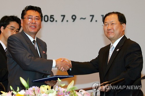 | △ "북한 김정은, 최영건 내각 부총리도 총살 처형" (서울=연합뉴스) 김정은 북한 국방위원회 제1위원장이 최영건 내각 부총리를 올해 총살 처형한 것으로 알려졌다. 익명을 요구한 대북 소식통은 12일 최영건 부총리가 지난 5월 김정은 제1위원장의 정책 추진에 불만을 표출했다가 총살됐다고 밝혔다. 사진은 지난 2005년 7월 12일 서울 홍은동 그랜드 힐튼호텔서 열린 제 10차 남북 경제협력추진위원회 종결회의에서 북측 대표단장으로 온 최영건 부총리(왼쪽)가 남측 박병원 대표단장과 남북협력 12개항이 명문화 된 합의서를 교환하는 모습. |