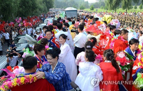 | △ 동아시안컵 우승 여자축구선수들 환영하는 평양시민들 (평양 조선중앙통신 = 연합뉴스) 북한 평양시민들이 10일 2015 동아시아축구연맹(EAFF) 축구선수권대회(동아시안컵)에서 우승하고 귀국한 북한 여자 축구선수들을 환영하고 있다. 2015.8.11 photo@yna.co.kr |