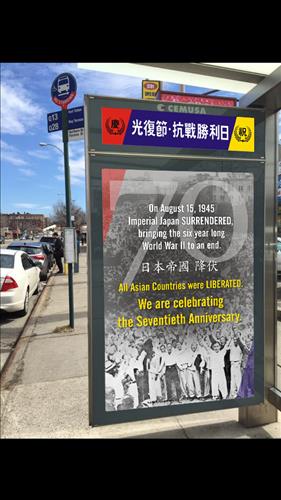 기업광고 제작업체인 '브리지 엔터프라이지스'(Bridge Enterprises)의 한태격 대표는 13일(현지시간) '광복절·항전승리일'이라는 한자 제목의 광고판을 직접 만들어 뉴욕 플러싱의 2개 버스정류장에 설치할 것이라고 밝혔다.