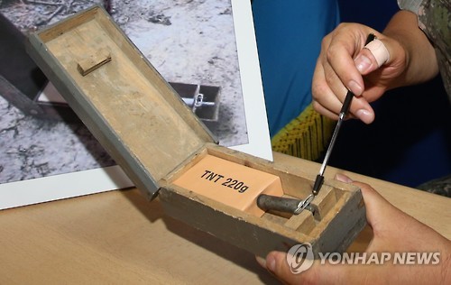 | △ 북한이 DMZ에 매설한 목함지뢰 (서울=연합뉴스) 임헌정 기자 = 10일 서울 용산 국방부에서 군 관계자가 북한이 비무장지대(DMZ)에 매설한 살상용 목함지뢰에 대해 설명하고 있다. 군 당국은 성명을 통해 강력한 보복응징 의지를 천명하면서 북한에 대해 사과와 책임자 처벌을 촉구했다. 2015.8.10 kane@yna.co.kr |