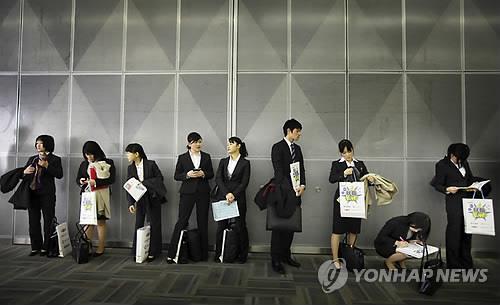 | △ '잃어버린 20년'으로 일컬어지는 일본의 장기 불황기에 취업시장에 처음 진입한 세대가 취업과 소득 등에서 소외된 '잃어버린 세대'로 남아 사회문제가 되고 있는 것으로 나타났다. 사진은 2011년 1월 도쿄에서 열린 기업 소개 행사에 줄을 선 구직자들 (AP=연합뉴스 자료사진) |