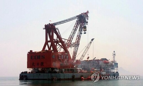 | △ 세월호 인양 중국 작업선 현장 도착 (진도=연합뉴스) 조근영 기자 = 해양수산부와 세월호 인양 계약을 체결한 상하이샐비지 컨소시엄 소속 1만1천706t 크레인 작업선 다리(大力)호와 450t 예인선 화허(華和)호가 지난 15일 진도 현장에 도착해 현장 조사 준비 작업을 하고 있다. 2015.8.16 chogy@yna.co.kr |