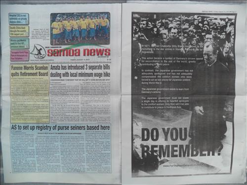 (서울=연합뉴스) 왕길환 기자 = 전 세계 미군 주둔지에 배포되는 일간지 '사모아 뉴스'(Samoa News)에 일본 정부는 일본군 위안부 문제에 대해 사죄를 하라고 촉구하는 내용의 전면 광고가 실렸다.