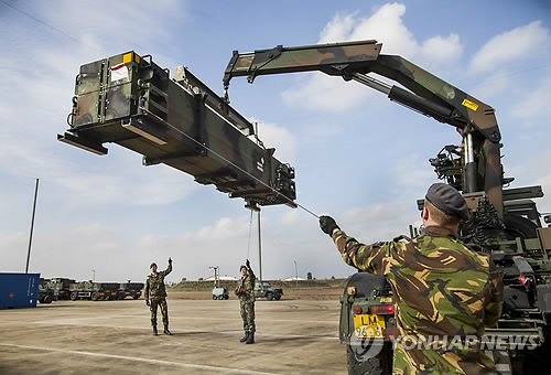 | △ 지난 2013년 터키 아다나 인근의 시리아 접경지에 나토(북대서양조약기구)의 패트리엇 미사일이 설치되고 있다. 이 패트리엇 미사일의 터키 배치는 인접국 시리아의 내전 여파를 막고 터키의 방공시스템을 지원하는 것이 목적으로 나토 회원국 터키의 요청에 의해 이루어졌다. (연합뉴스 자료사진) |