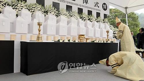 | △ 2010년 5월 19일 충남 천안 망향의 동산에서 일본 강점기 때 군인 또는 군속으로 국외로 강제동원됐다가 사망한 무연고자의 유골 등 한국인 희생자 유골 219위 봉환 추도식이 열리고 있다.(연합뉴스 자료사진) |