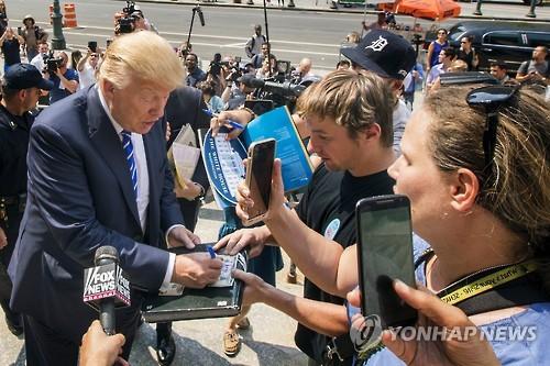(워싱턴=연합뉴스) 신지홍 특파원 = 미국 공화당 대선후보 중 지지율 1위를 달리는 도널드 트럼프의 일거수일투족이 화제다.