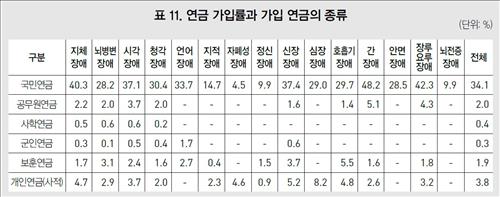 장애인 중 개인연금 가입자는 3.8%에 그쳤으며 공무원 연금, 사학연금, 군인연금, 보훈연금 가입률도 각각 2.0%, 0.4%, 0.3%, 1.9% 뿐이었다.