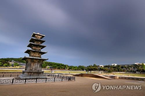 | △ (부여=연합뉴스) 김주형 기자 = 부여 정림사지 오층석탑(국보 제9호)은 완벽한 비례미를 보여주는 전형적인 백제의 탑이다. 높이는 8.8m이며, 화강암으로 만들어졌다. 화재로 인해 기단부와 지붕돌의 윗부분만 하얗고 몸돌 아래쪽은 거뭇하게 얼룩져 있다. kjhpress@yna.co.kr |