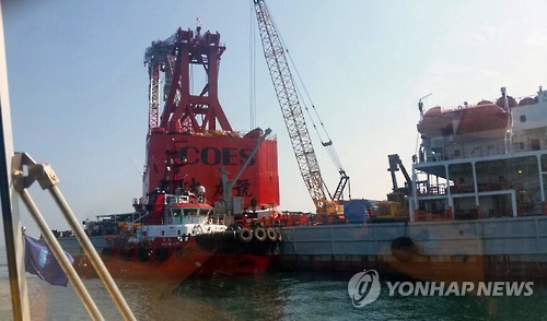 | △ 세월호 인양 중국 작업선 현장 도착 (진도=연합뉴스) 조근영 기자 = 해양수산부와 세월호 인양 계약을 체결한 상하이샐비지 컨소시엄 소속 1만1천706t 크레인 작업선 다리(大力)호와 450t 예인선 화허(華和)호가 지난 15일 진도 현장에 도착해 현장 조사 준비 작업을 하고 있다. 2015.8.16 chogy@yna.co.kr |