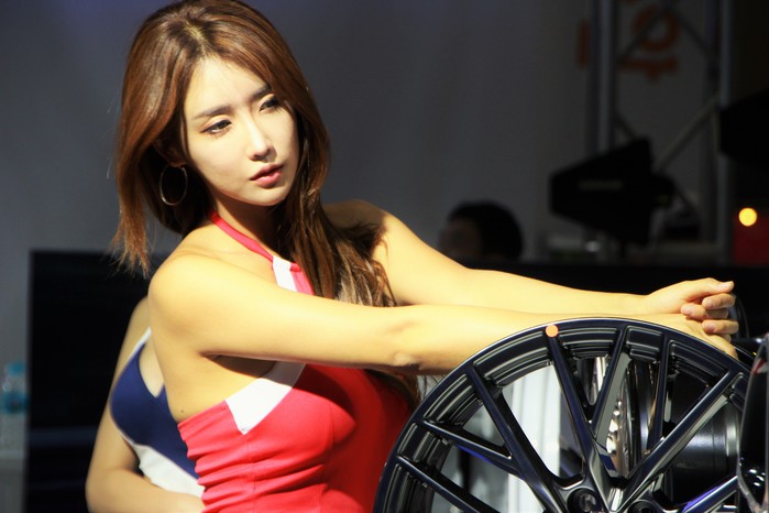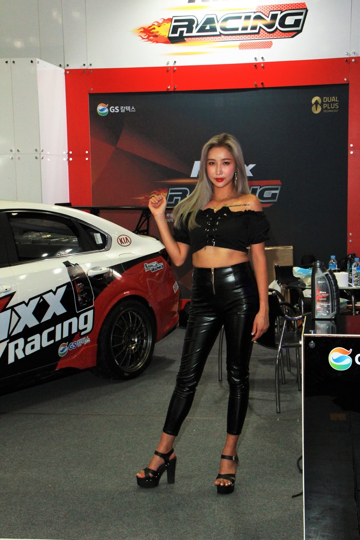 [사진설명] 2019 오토살롱위크 레이싱 모델 한국쉘 카센타 부스 모델 공다솔이 잘록한 개미허리를 뽐내고 있다.