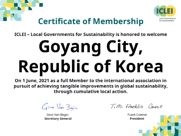 [부자동네타임즈 김인수기자] 고양시가 세계 최대 지방정부 네트워크인 ‘이클레이(ICLEI)’에 가입해 지난 6월 17일 회원 도시 인증서를 전달 받았다.