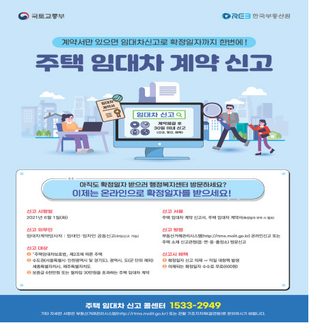 신고 대상은 보증금 6천만원 또는 월세 30만원을 초과하는 임대차 계약(금액 변동이 있는 갱신계약 포함)으로 계약 체결일로부터 30일 이내에 해당 부동산 소재지 관할 행정복지센터를 방문하거나 부동산거래관리시스템을 통해 신고하면 된다.