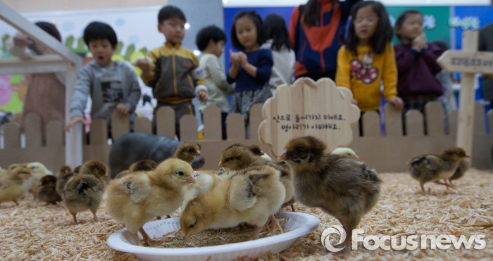 (전주=포커스뉴스) 27일 오후 전북 전주시 농촌진흥청 농업과학관 특별전시관에서 열린 우리 축산자원의 6차산업화 이야기 특별전시회에서 어린이들이 꼬꼬댁, 꼬꼬농장 병아리 체험을 하고 있다. 이번 전시회는 축산자원에 대한 국민적 공감대를 형성하고 6차산업화 성과를 널리 알려 일반인이 축산을 좀더 가까이 느낄 수 있도록 마련됐다.