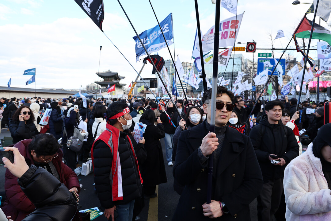 [부자동네타임즈 = 이의수 기자] 25일 오후 서울 광화문에서 윤석열 즉각 퇴진·사회 대개혁 비상행동 주최로 열린 에서 깃발행진 퍼레이드가 진행되고 있다. 2025.1.25