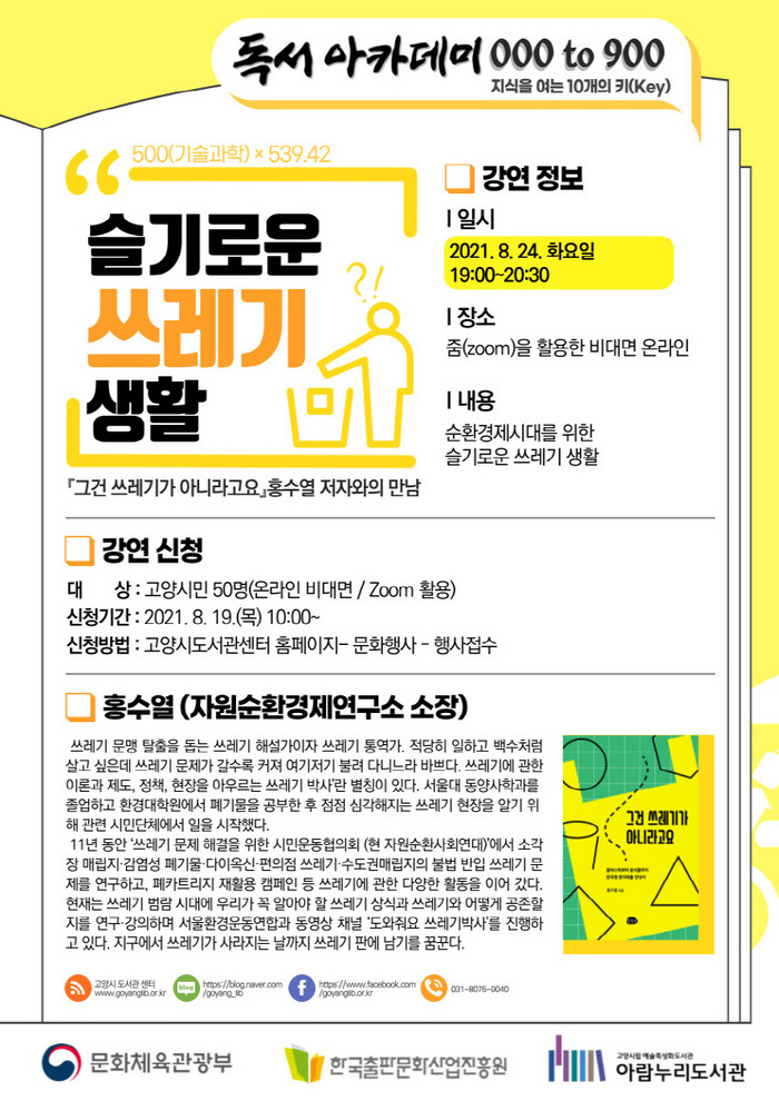 [부자동네타임즈 김인수기자] 고양시 아람누리도서관은 독서아카데미(한국출판문화진흥원 주관) 시즌 2를 마치며, 오는 8월 24일(화) 오후 7시, 환경 주제 강연 「순환경제 시대를 위한 슬기로운 쓰레기 생활」을 개최한다.