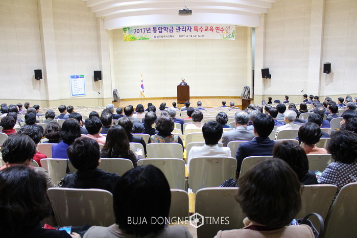 | △광주시교육청이 일반학교에 배치된 장애학생들의 교육차별 해소와 학습권 보장 그리고 통합교육 활성화를 위해 '2017 통합학급 관리자 특수교육 연수회'를 개최했다 |