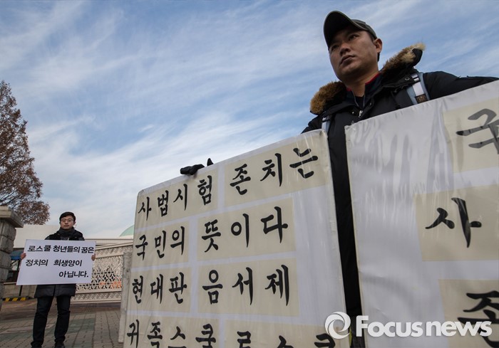 법조인협회는 “여러 진통이 있었지만 뒤늦게나마 로스쿨 교수들과 재학생들이 본연의 자리로 돌아간 것에 환영의 뜻을 표한다”며 “로스쿨 구성원들은 국민이 우리 법조에 부여한 신뢰의 의미와 무게를 이해하고 진정한 사법개혁을 위해 기득권을 내려놓는 모습을 보이길 바란다”고 촉구했다.사법시험 존폐에 관한 논쟁이 격화되고 있는 가운데 지난 9일 오전 서울 여의도 국회 앞에서 사법고시 존치를 주장하는 1인 시위 뒤로 서울대학교 로스쿨 2학년에 재학 중인 강태승씨가 사법시험 폐지 유예에 항의하는 1인 시위를 하고 있다. 2015.12.09 성동훈 기자