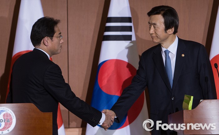 | △ 악수하는 윤병세 외교부장관과 기시다 후미오 일본 외무상 |