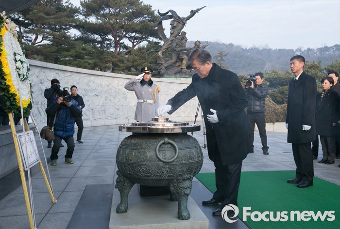 (서울=포커스뉴스) 병신년(丙申年) 새해 첫 날인 1일 오전 동작구 국립서울현충원에서 문재인 더불어민주당 대표가 현충탑 참배를 하고 있다.