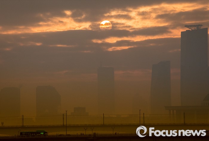 (서울=포커스뉴스) 2016 병신년(丙申年) 첫날인 1일 아침 서울 영등포구 선유도에서 보이는 도심 속 첫 해가 짙은 안개와 구름 사이로 모습을 드러내고 있다.