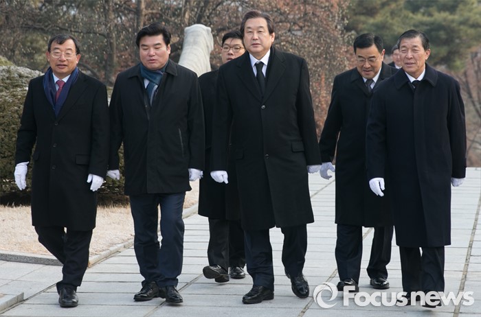 (서울=포커스뉴스) 병신년(丙申年) 새해 첫 날인 1일 오전 동작구 국립서울현충원에서 김무성 새누리당 대표 등 지도부가 이승만 전 대통령 묘역 참배를 위해 이동하고 있다.