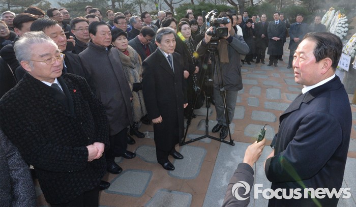 (서울=포커스뉴스) 병신년(丙申年) 새해 첫 날인 1일 오전 동작구 국립서울현충원에서 통합신당을 추진 중인 박주선 무소속 의원이 김대중 전 대통령 묘역 참배를 마친 뒤 관계자들에게 새해 인사를 하고 있다.