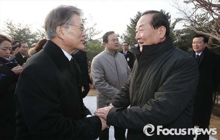(서울=포커스뉴스) 병신년(丙申年) 새해 첫 날인 1일 오전 동작구 국립서울현충원 김영삼 전 대통령 묘역에서 서청원(오른쪽) 새누리당 최고위원과 문재인 더불어민주당 대표가 우연히 만나 인사하고 있다.