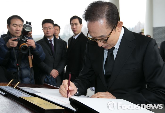 (서울=포커스뉴스) 병신년(丙申年) 새해 첫 날인 1일 오전 동작구 국립서울현충원에서 이명박 전 대통령이 현충탑 참배를 마친 뒤 방명록을 작성하고 있다.