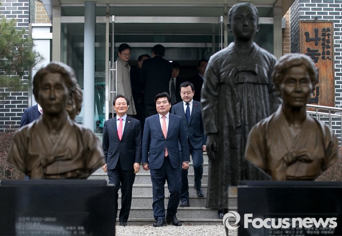 (광주=포커스뉴스) 병신년(丙申年) 새해 첫 날인 1일 오후 원유철 새누리당 원내대표 등 의원들이 경기도 광주 일본군 위안부 피해자 쉼터 나눔의 집을 방문해 간담회를 마친 뒤 나서고 있다.