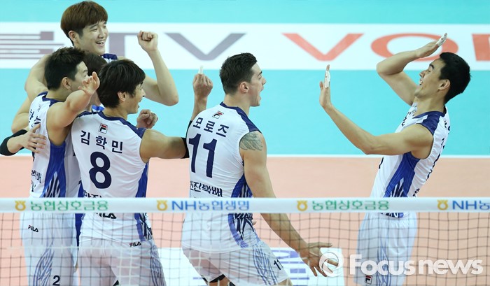 (인천=포커스뉴스) 3일 인천 계양체육관에서 열린 '2015-2016NH농협 V-리그' 남자부 대한항공-삼성화재 경기에서 이마로 블로킹을 성공시킨 대한항공 김형우가 동료들과 함께 기뻐하고 있다.