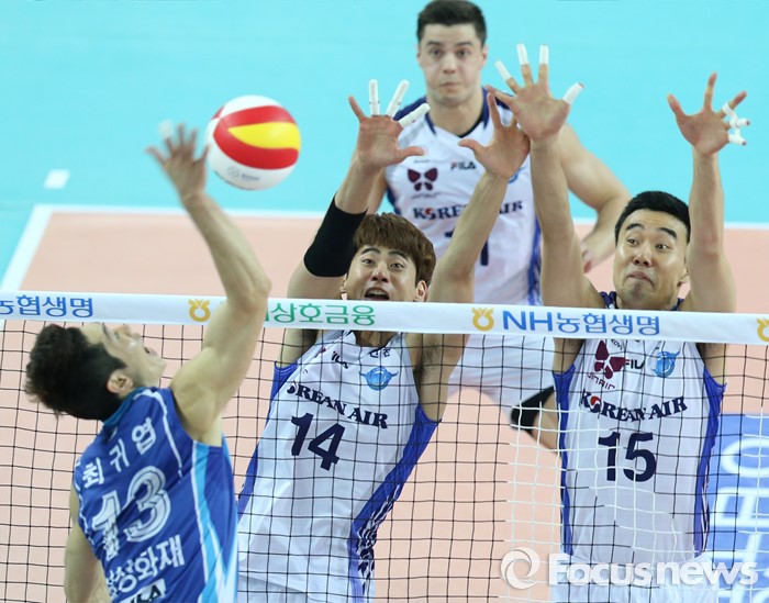 (인천=포커스뉴스) 3일 인천 계양체육관에서 열린 '2015-2016NH농협 V-리그' 남자부 대한항공-삼성화재 경기에서 대한항공 심홍석(14), 김형우가 삼성화재 최귀엽의 스파이크를 블로킹으로 막고 있다.
