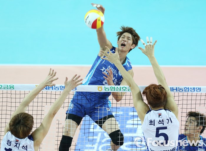 (인천=포커스뉴스) 3일 인천 계양체육관에서 열린 '2015-2016NH농협 V-리그' 남자부 대한항공-삼성화재 경기에서 삼성화재 류윤식이 대한항공 최석기, 정지석의 블로킹을 따돌리며 스파이크를 하고 있다.