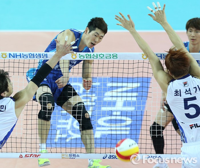 (인천=포커스뉴스) 3일 인천 계양체육관에서 열린 '2015-2016NH농협 V-리그' 남자부 대한항공-삼성화재 경기에서 삼성화재 최귀엽이 대한항공 김학민, 최석기의 블로킹을 따돌리며 스파이크를 하고 있다.