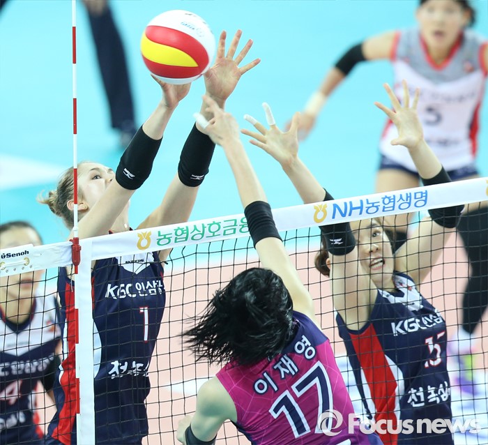 (인천=포커스뉴스) 3일 인천 계양체육관에서 열린 '2015-2016NH농협 V-리그' 여자부 흥국생명-KGC인삼공사 경기에서 흥국생명 이재영이 KGC인삼공사 헤일리와 문명화의 이중 블로킹에 연타 공격하고 있다.