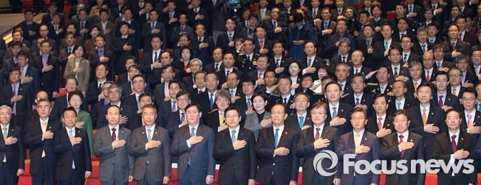 (세종=포커스뉴스) 황교안 국무총리와 각 부처 장·차관들이 4일 오전 세종시 정부세종청사 대강당에서 열린 2016년 정부시무식에 참석해 국기에 대한 경례를 하고 있다.