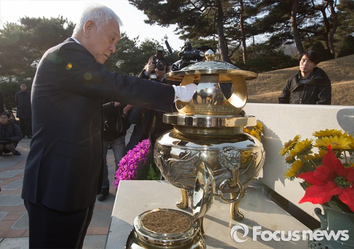 (서울=포커스뉴스) 김한길 무소속 의원이 4일 오전 서울 동작구 국립서울현충원 故 김대중 전 대통령 묘역을 찾아 참배를 하고 있다.
