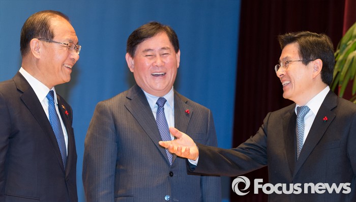 (세종=포커스뉴스) 황교안(오른쪽) 국무총리가 4일 오전 세종시 정부세종청사 대강당에서 열린 2016년 정부시무식에서 최경환 경제부총리 겸 기획재정부장관, 황우여(왼쪽) 사회부총리겸 교육부장관과 대화를 나누고 있다.